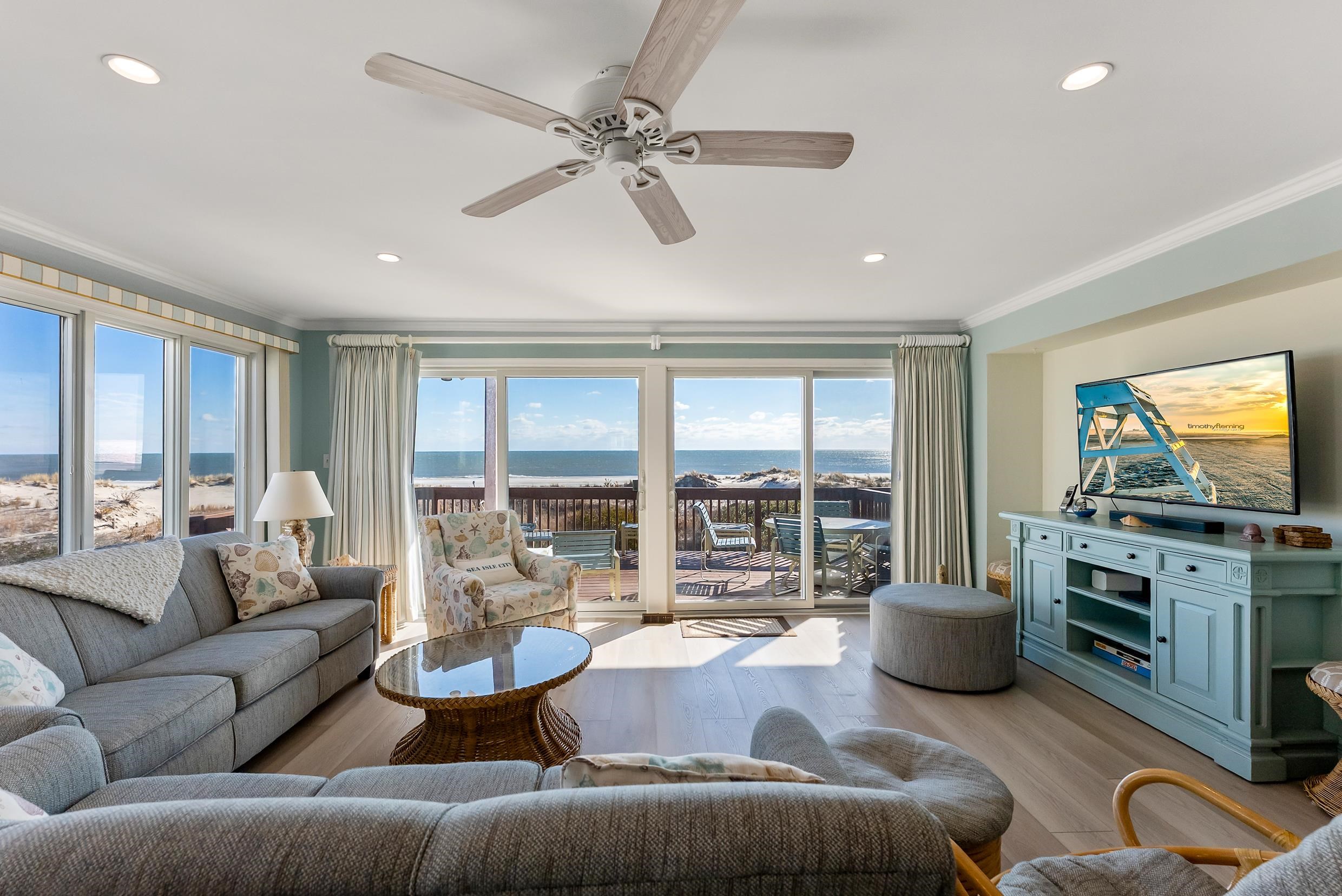 Introducing an exceptional direct oceanfront property located in the desirable South End of Sea Isle City on highly coveted Pleasure Avenue. This beautiful townhome features four spacious bedrooms, three and a half bathrooms, and four expansive decks, three of which offer spectacular ocean views. This beautiful home features three levels. The first level has a spacious oceanfront master bedroom with an ensuite bathroom and a private deck. There are two more bedrooms and one hallway bathroom on this level. The street-side bedroom also features a private deck. The second level has an incredibly designed open floor plan with a custom kitchen, and a spacious dining & living area that leads to a large oceanfront deck, perfect for soaking in panoramic ocean vistas and morning sunrises over the waves. The top floor offers the main master bedroom, complete with a private bathroom and a private oceanfront deck that invites you to indulge in stunning views from every angle. Recent updates include a new roof and a hot water heater in 2024. The HVAC system and the washer and dryer were replaced in 2019. The main floor underwent a complete makeover in 2023, resulting in a new custom kitchen with all-new stainless-steel appliances, granite countertops, new living room furniture, new drapes, and a new bathroom vanity. The dining room set was replaced in 2021 along with new sliders in both the main living level, and the first floor beachfront bedroom. The top-floor master bedroom had new windows and sliders that were added in 2018, and new furniture was introduced in the first-floor bedroom facing Pleasure Avenue in 2019. This property is being sold completely furnished, less personal items, and has an impressive rental history upon request. This is truly an exceptional oceanfront opportunity. Come see this remarkable home and all it has to offer.